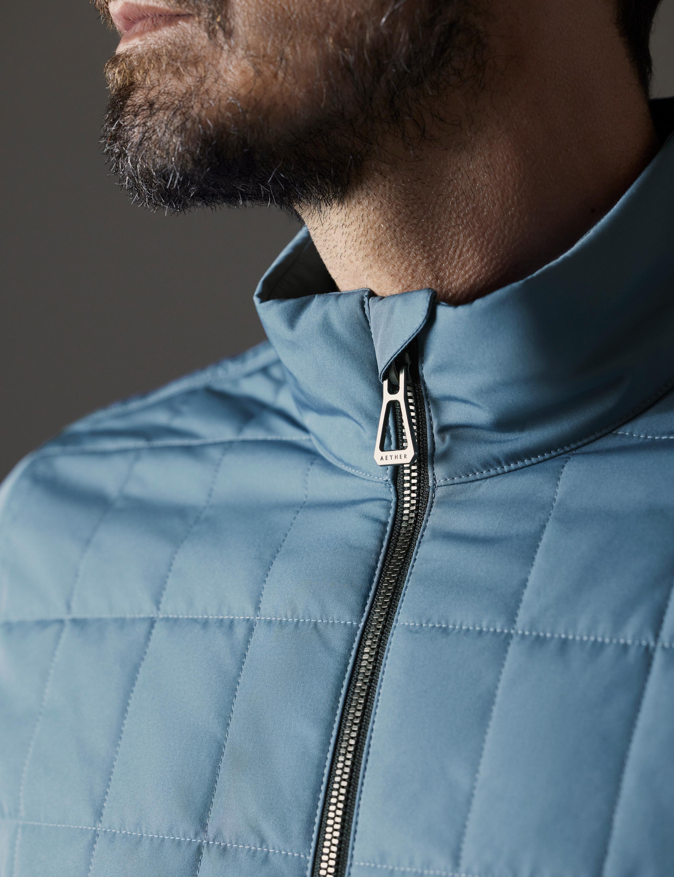 The Alto’s design details include a stand collar, a zipper garage on the top collar to keep cold metal from pressing against the skin, and a blue contrast-color interior. There is also a shaped hem and AETHER-logo embroidery on the back collar.