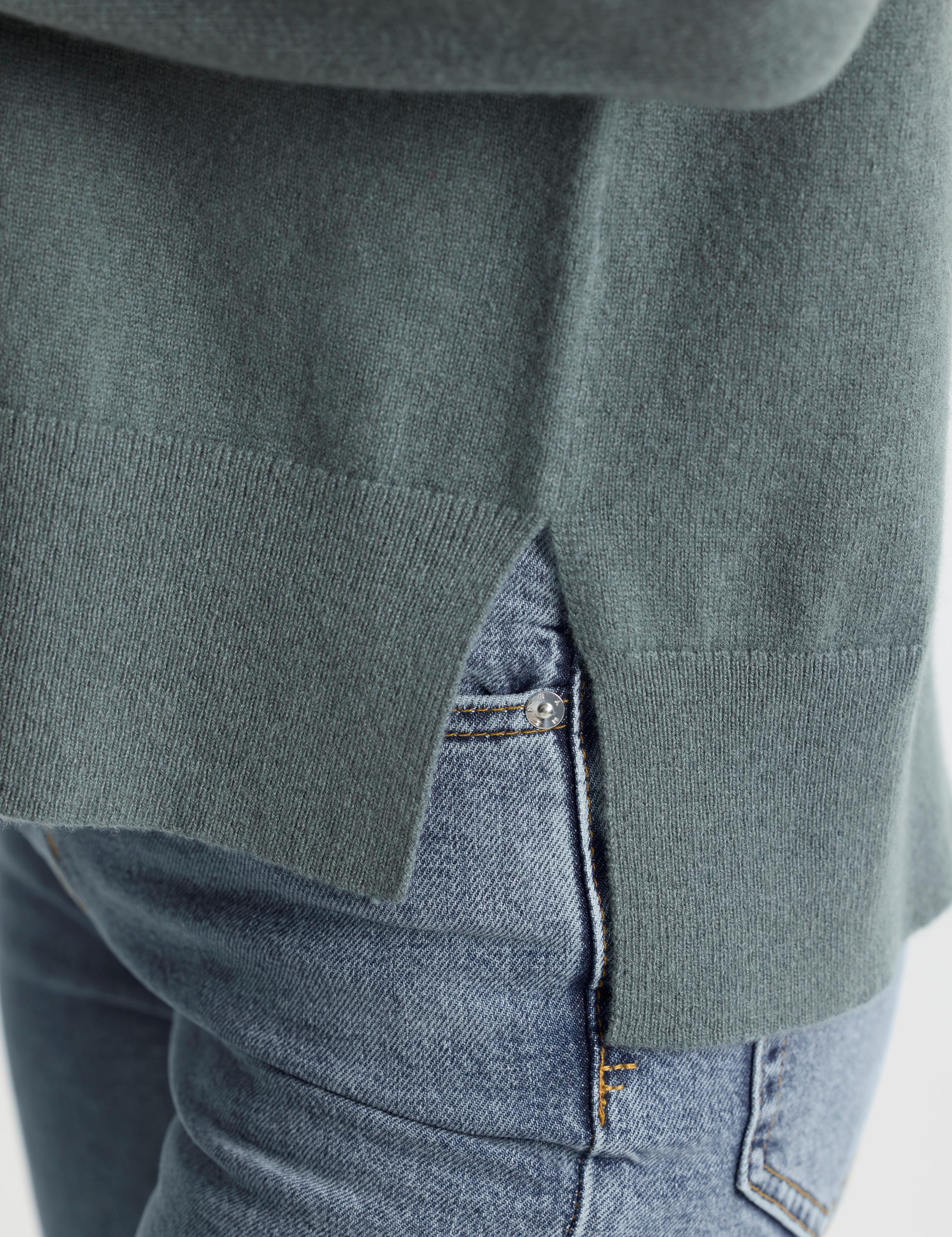 Complementing the sweater’s design is a step hem with mobility-bolstering side slits, and fully-fashioned armholes.