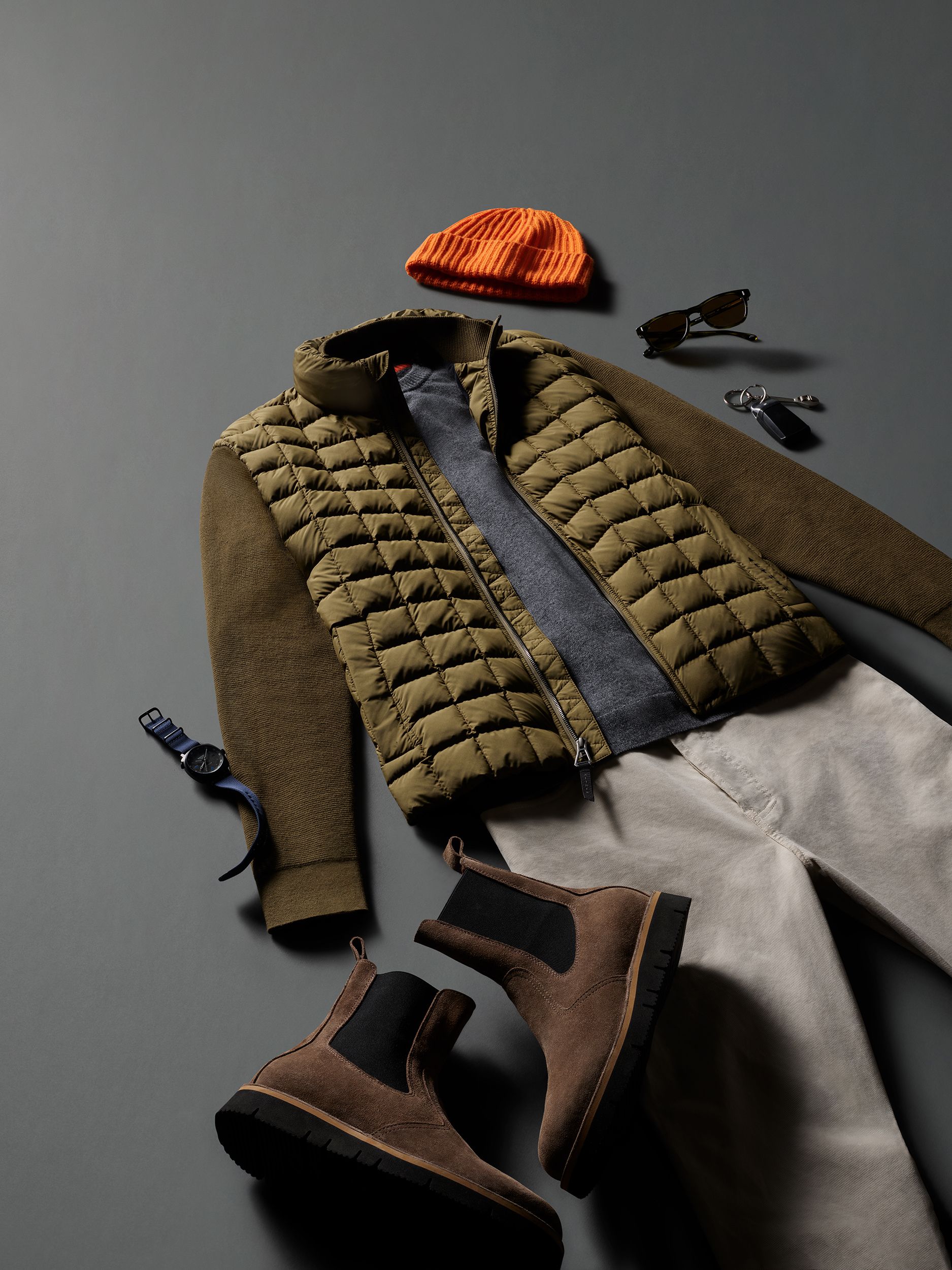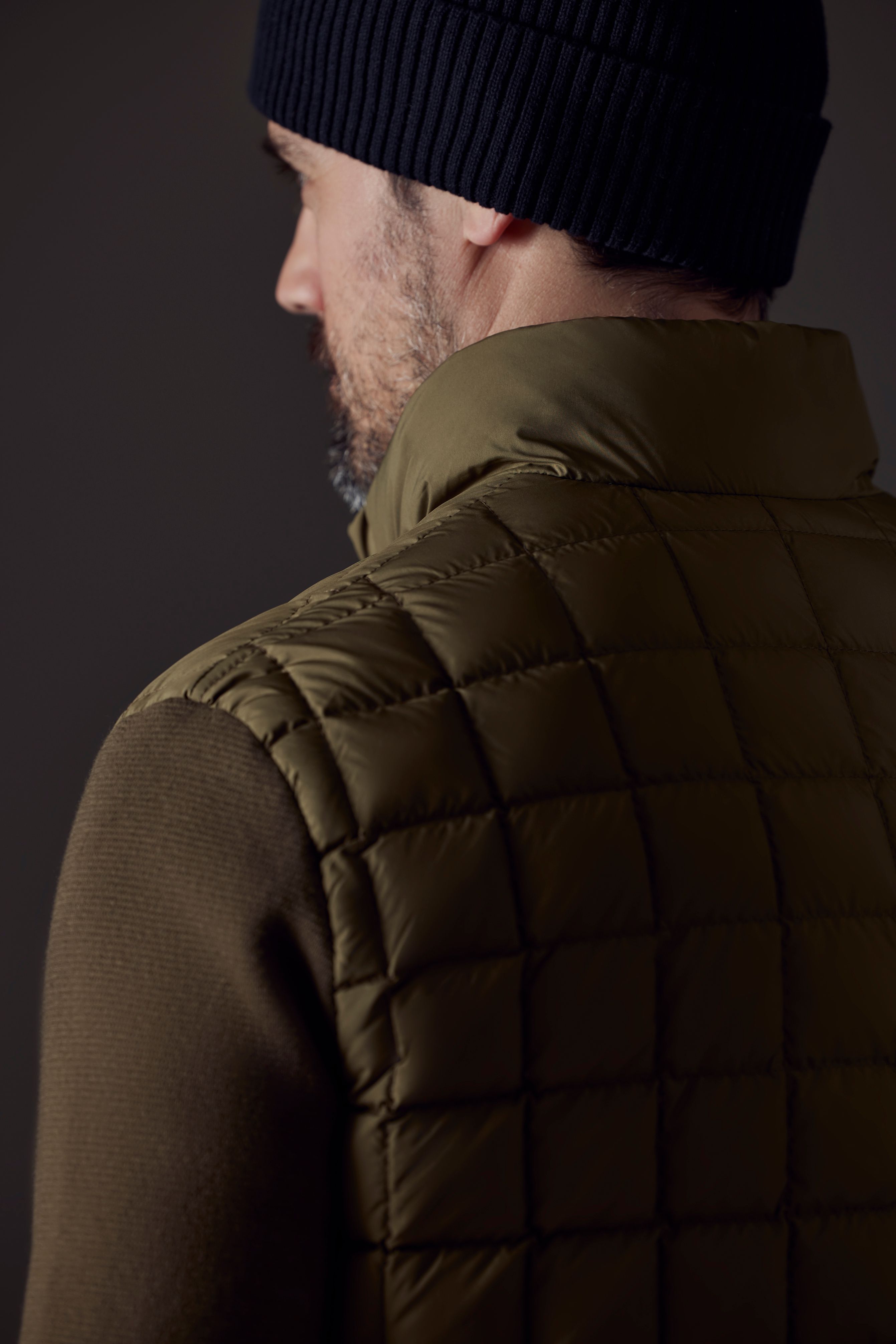 The Men’s Phase Full-Zip features 800-fill-power goose-down, box-quilted insulation at the body and exterior collar and a cotton-cashmere blend at the sleeves, side panels, and on the interior of the collar.