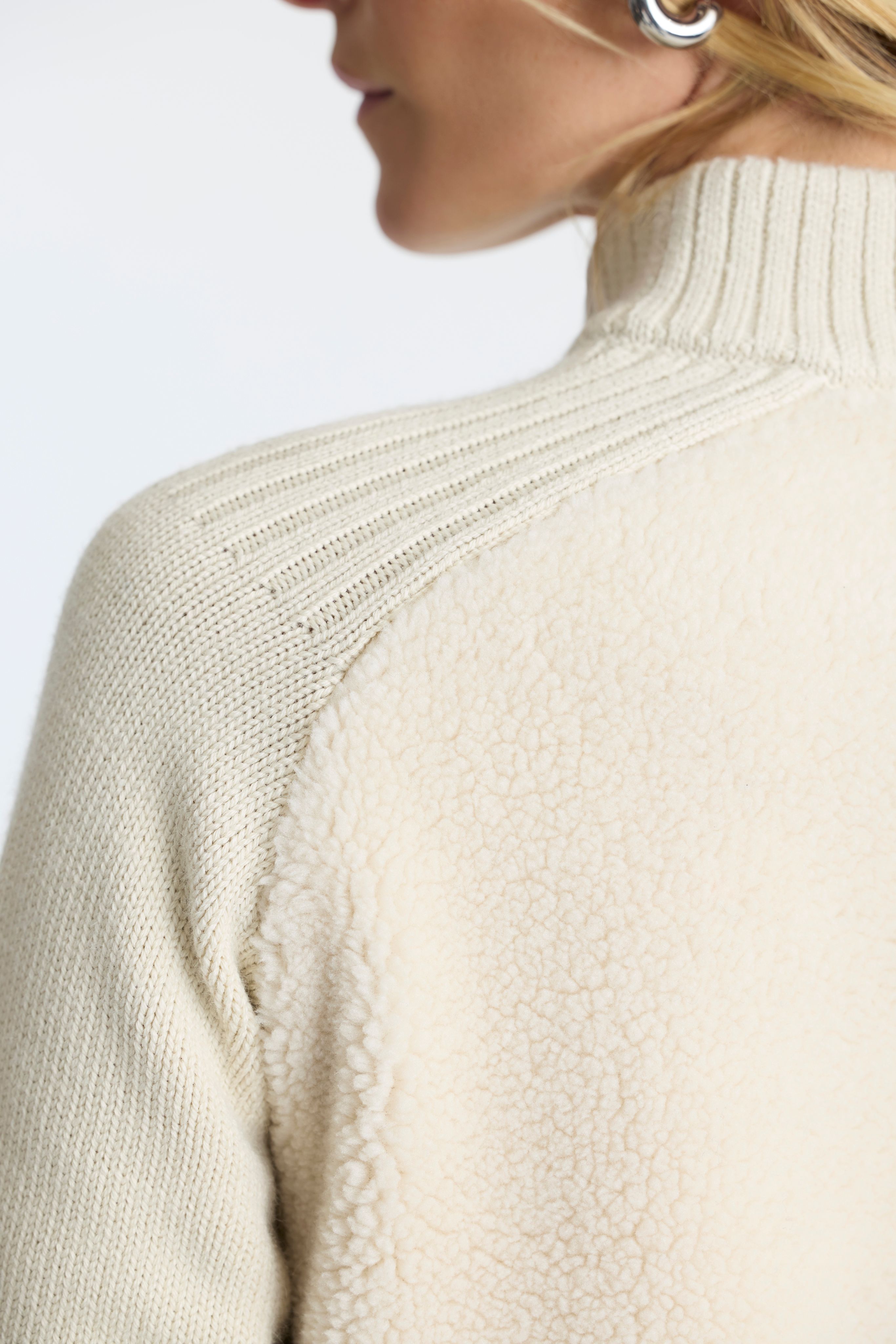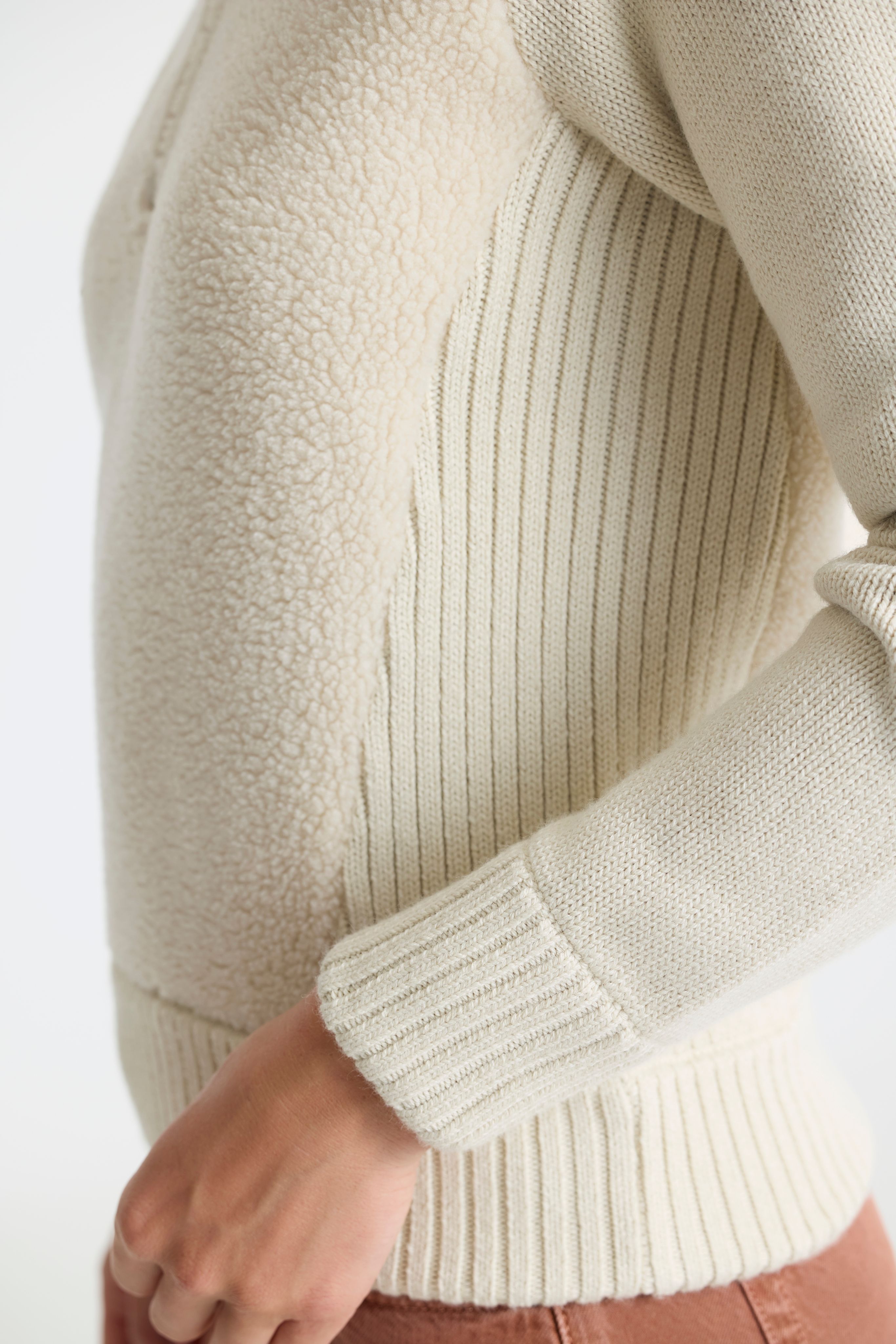 The main body of the sweater is made from a contrasting shearling-bonded heavyweight fleece that’s derived from recycled material.