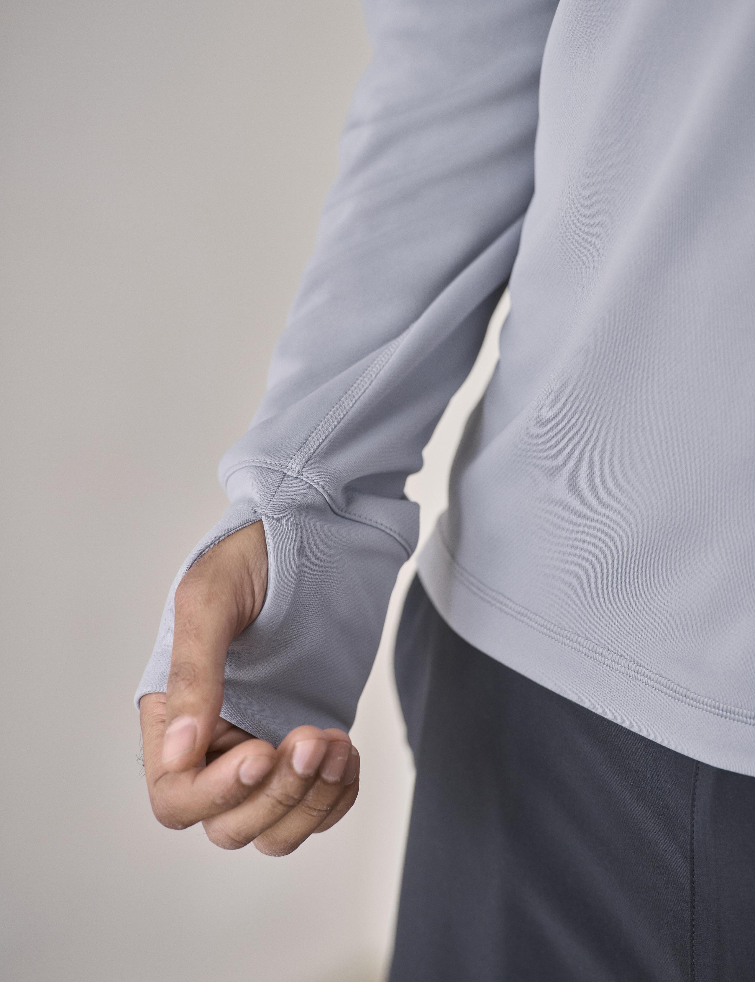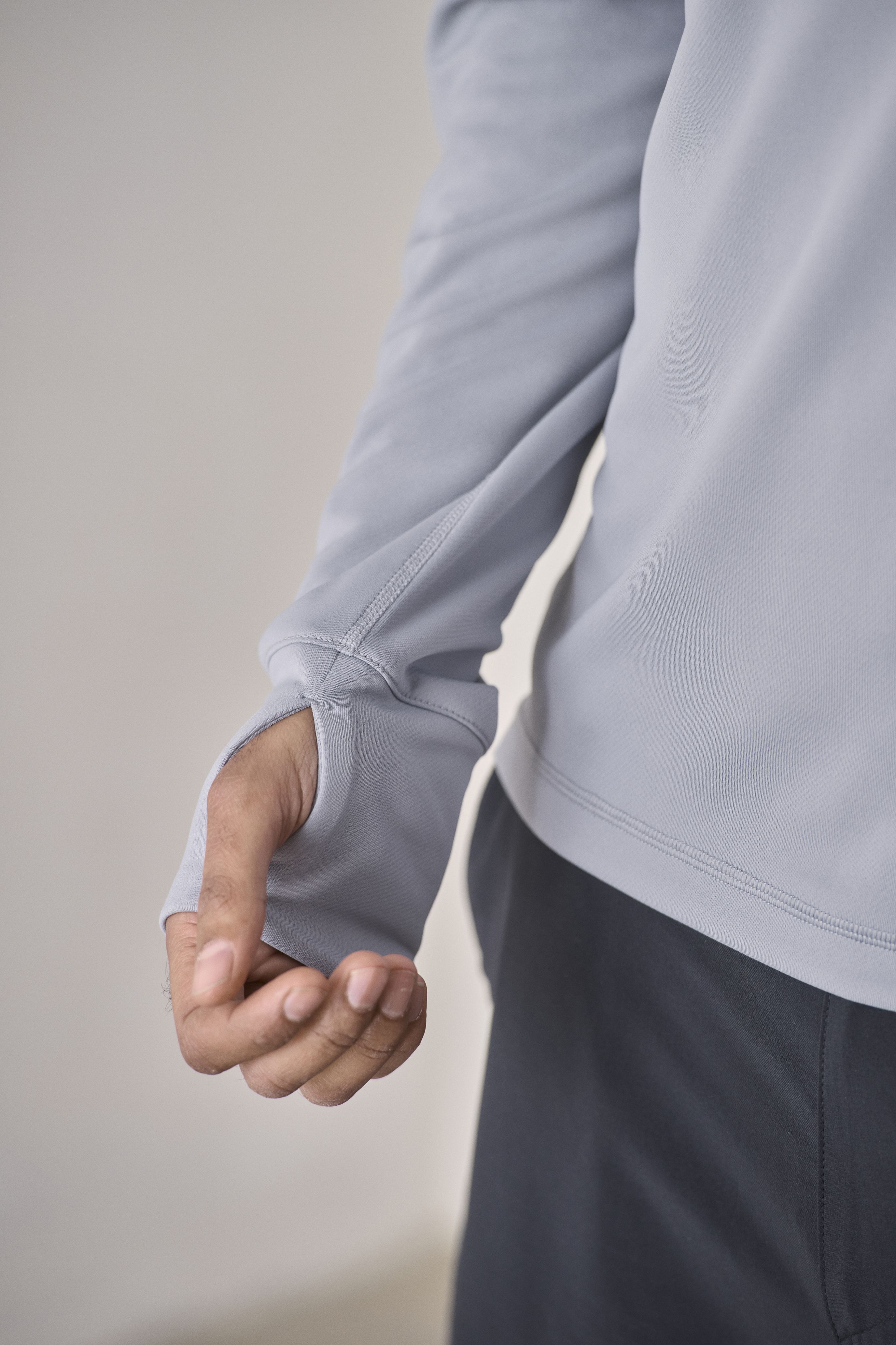 Its cuffs are finished with on-seam thumbholes with bartack reinforcements, top and bottom.