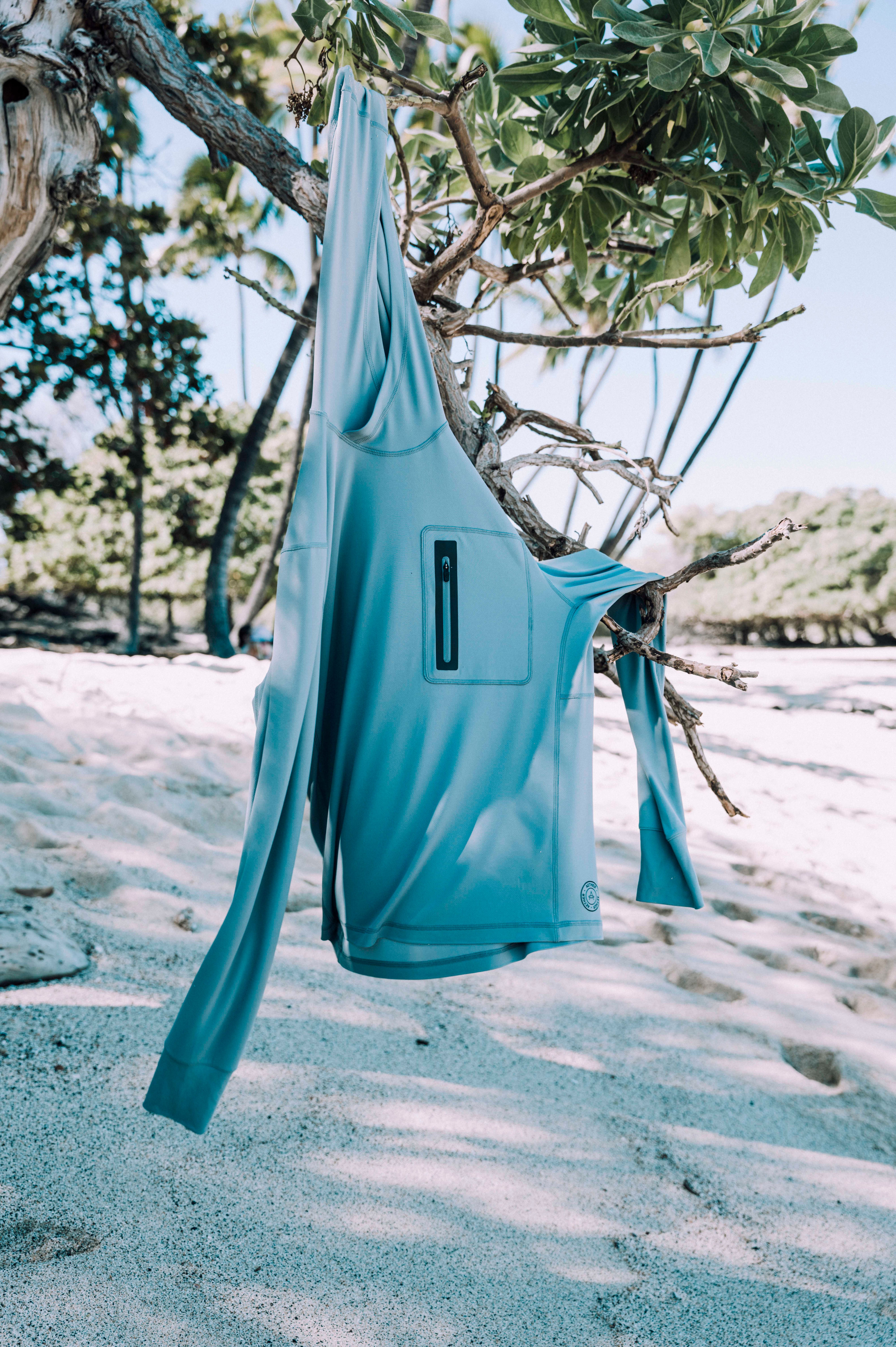 In lieu of a traditional kangaroo pocket, the Pacific Hooded Sun Shirt sports an offset patch-style chest pocket that’s outfitted with a #3 reverse coil zipper-secured closure.