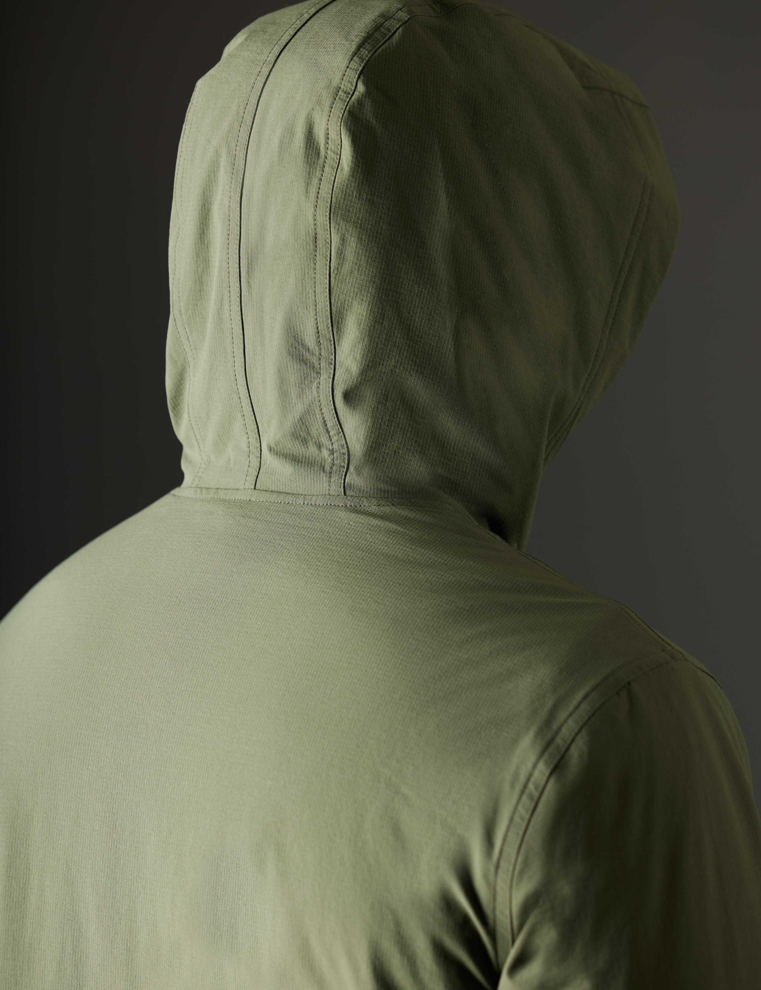 This garment’s fabric has been specially engineered to resist harsh, whipping winds.