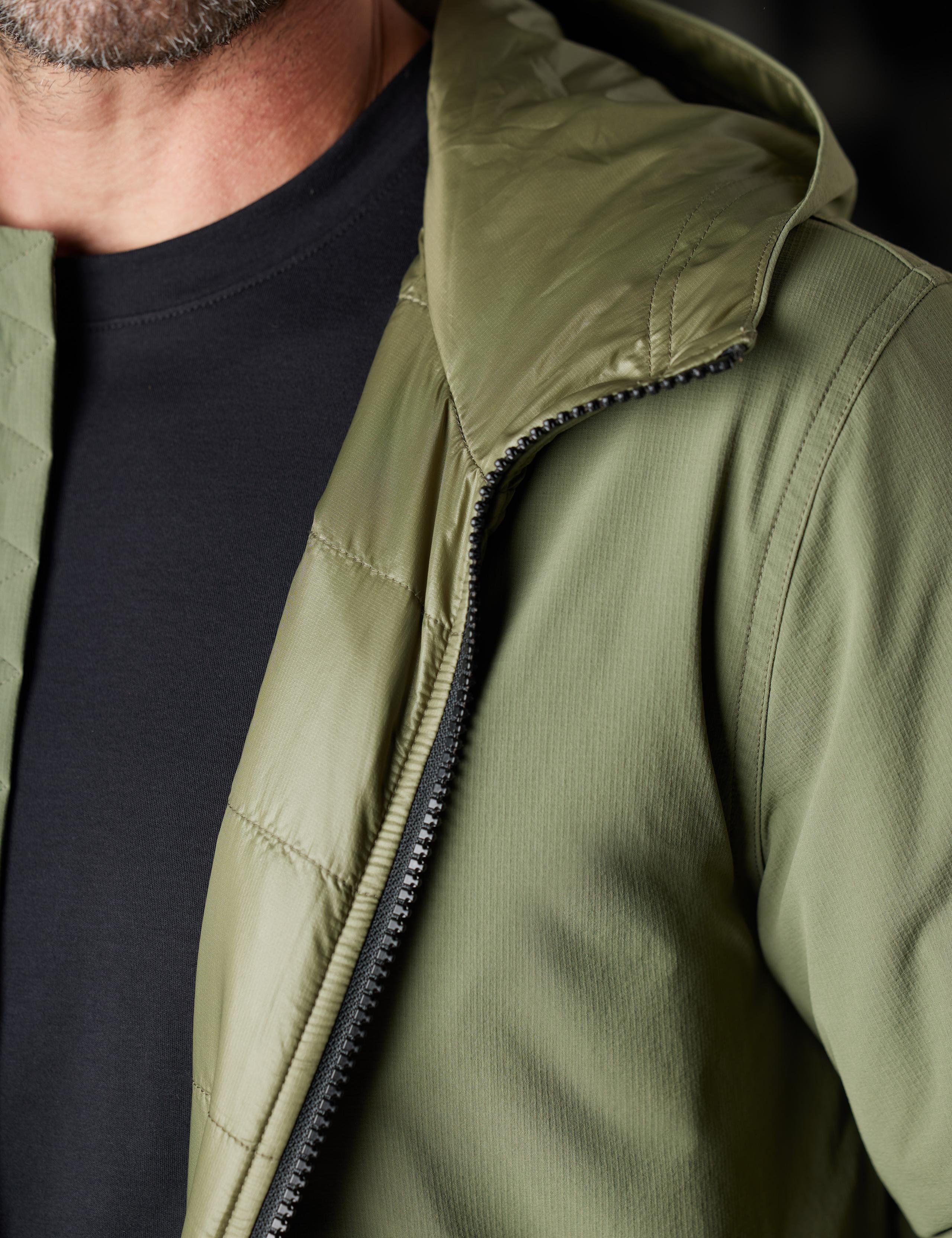 The Stornaway Insulated Hoodie is constructed from recycled nylon ripstop fabric with added spandex for unrestricted motion.