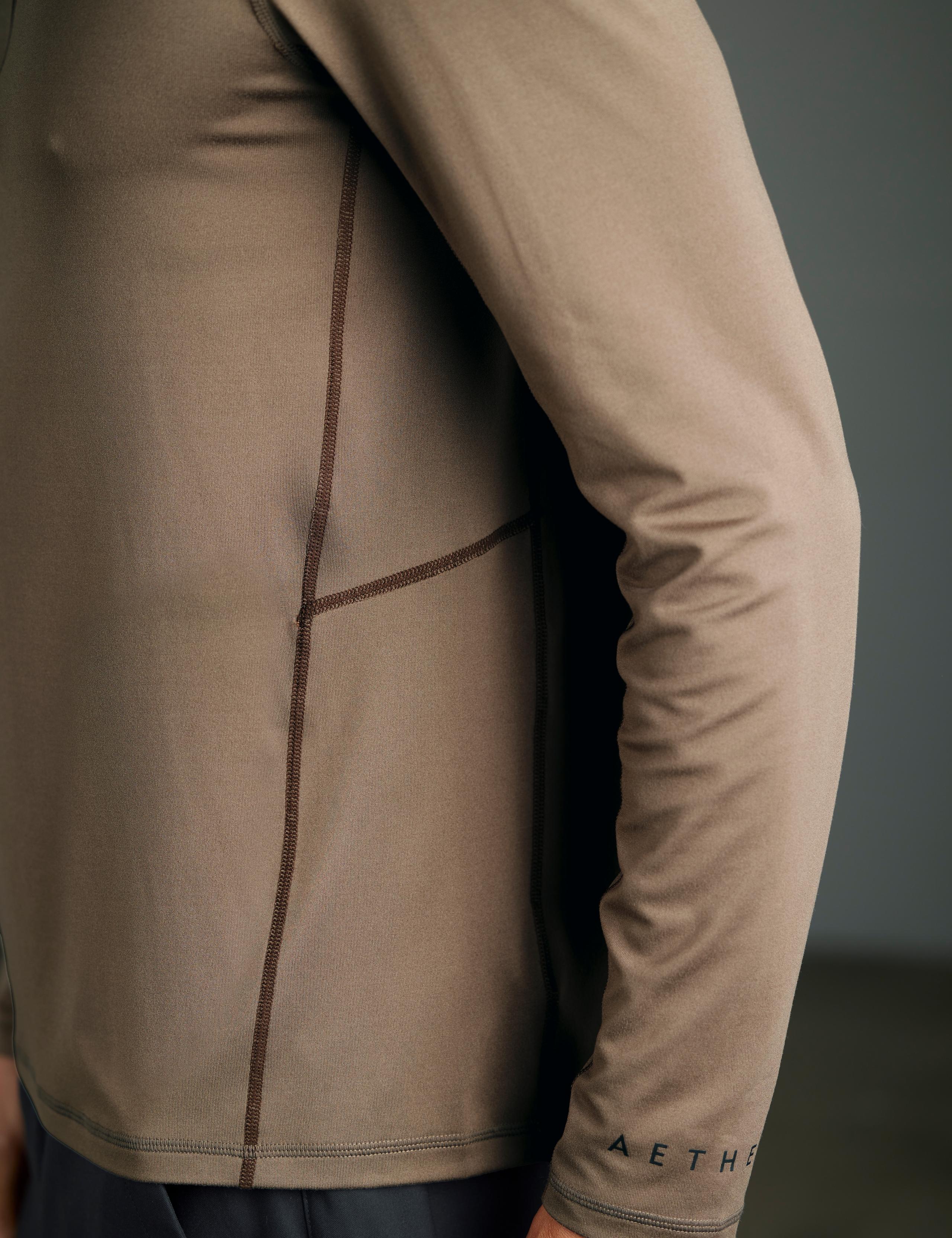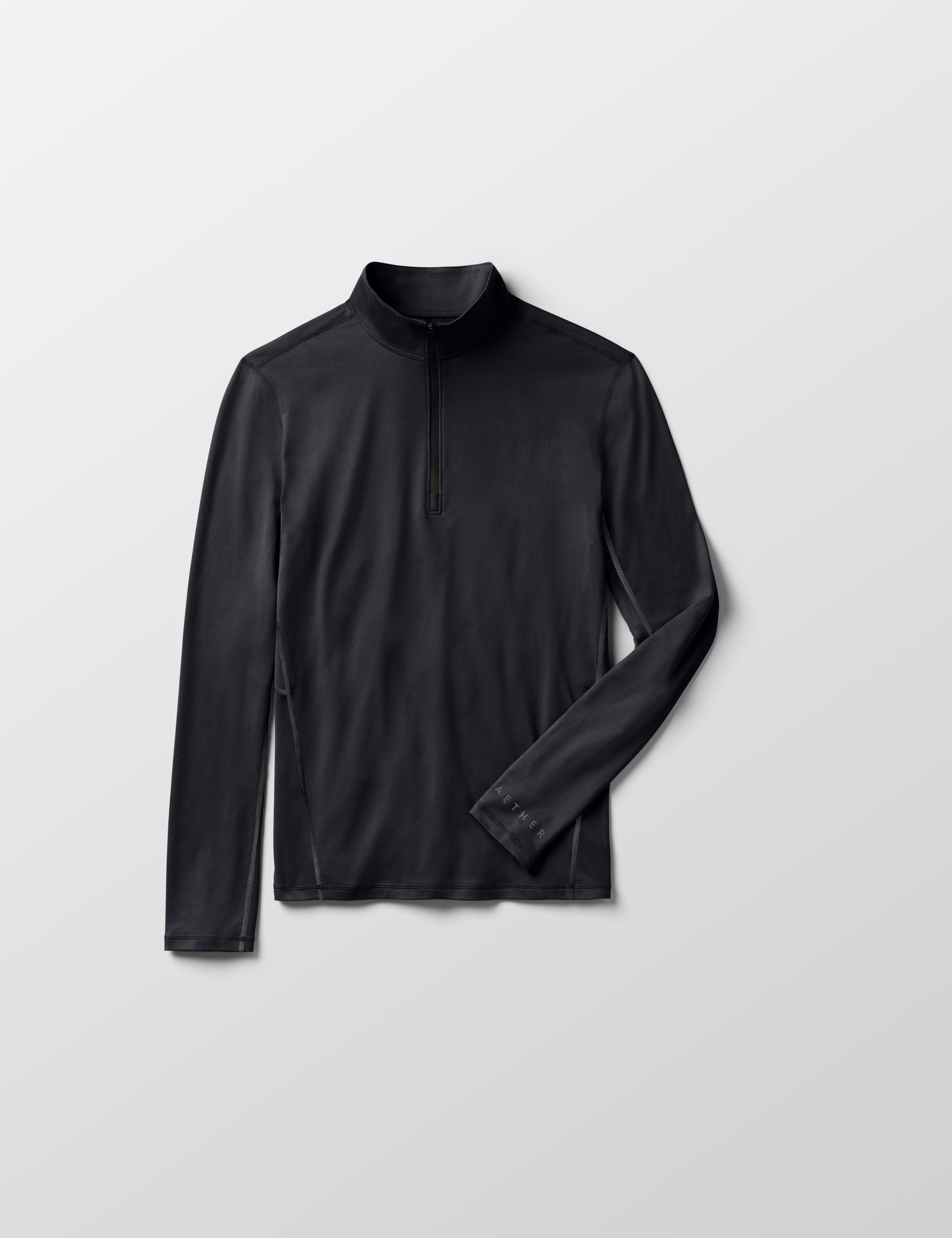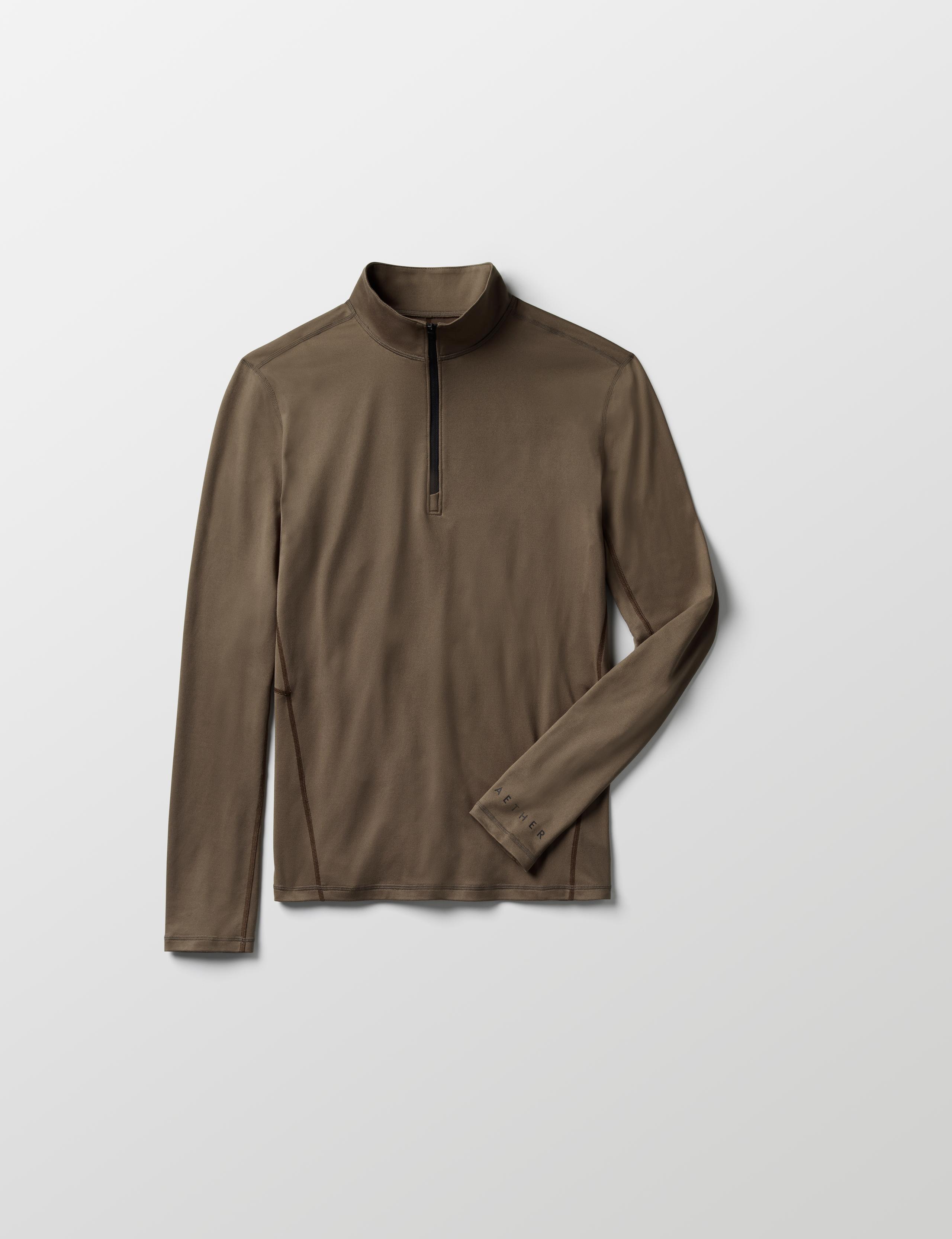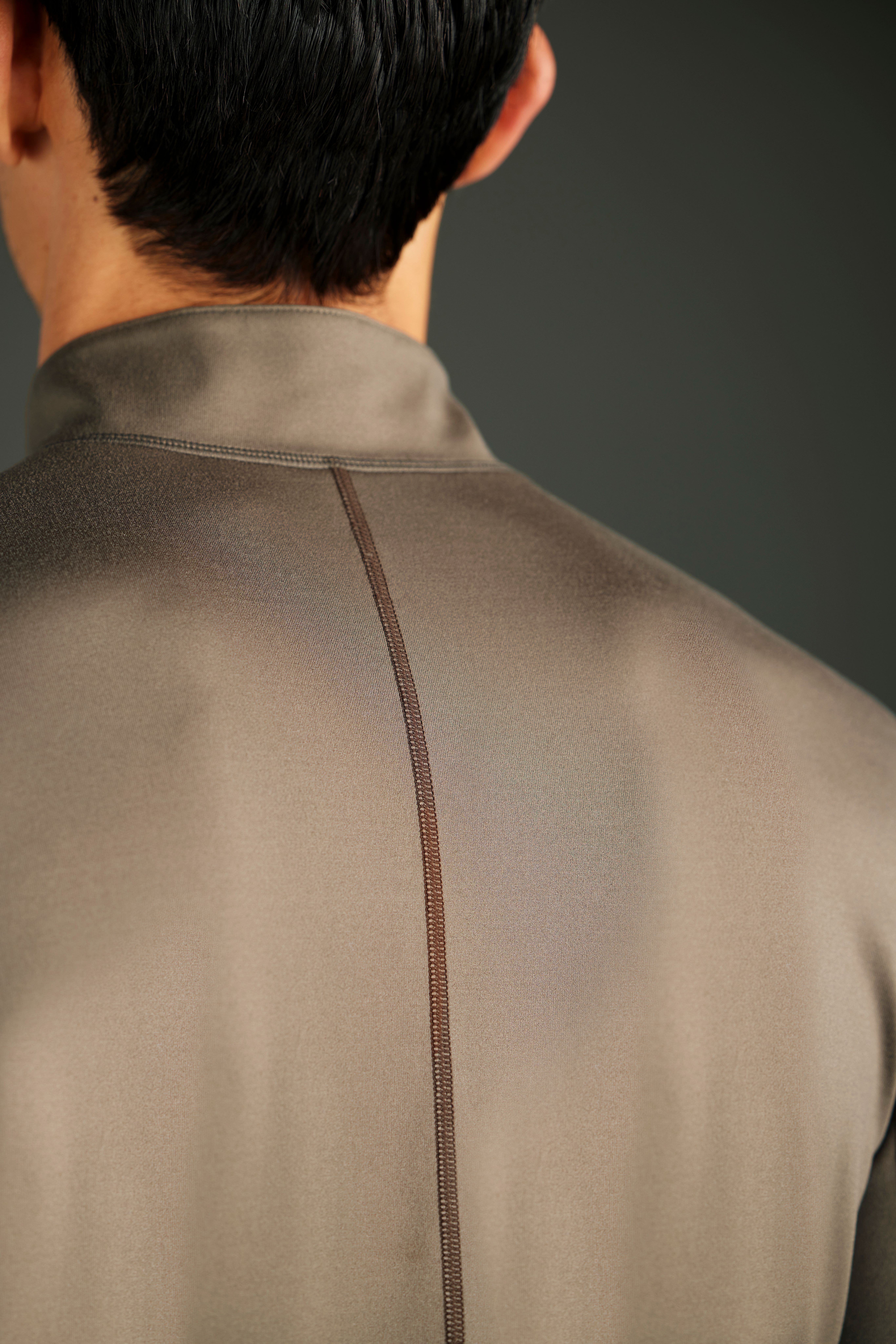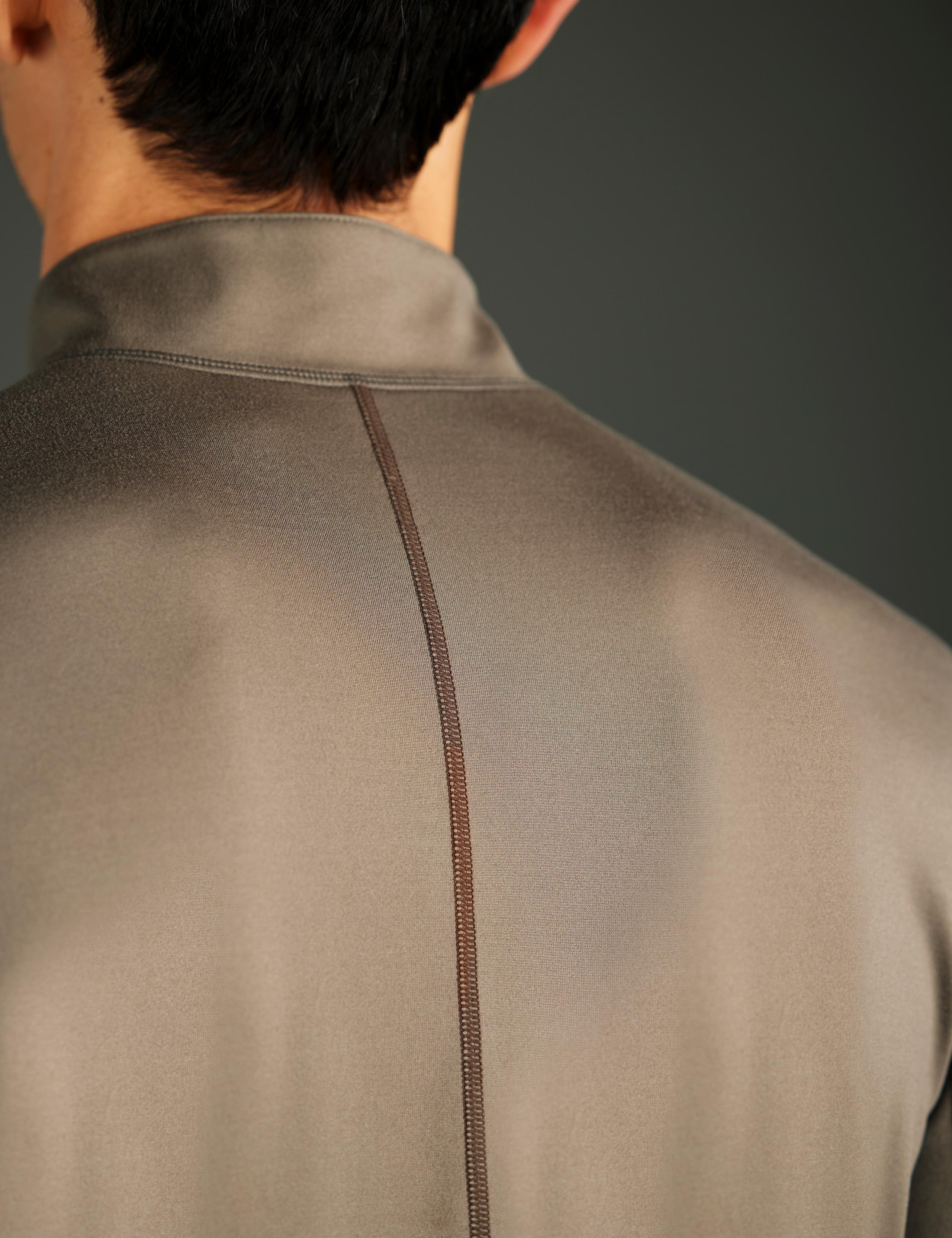 Its minimal, sophisticated mock neck design and contrast thread along the side panels, sleeve, and center back seam contributes to a refined design.